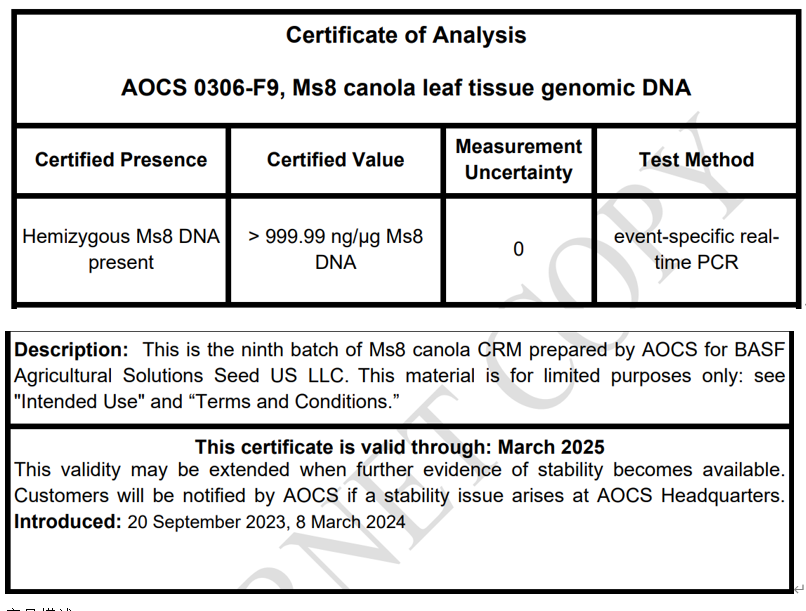 Ms8 canola leaf tissue genomic DNA产品描述AOCS 0306-F9由AOCS从干净叶子中提取的半发酵油菜基因组DNA制备而成。AOCS 0306-F9可用于无菌、0.5 mL带踢脚螺钉盖的自封管中,其中含有约10µg的DNA。每个样品含有约45.3µL,浓度为194.3 ng/µL。用户被告知,该参考材料是由巴斯夫农业解决方案种子美国有限责任公司从Ms8油菜籽的干净叶子中提取的基因组DNA制成的。Ms8油菜叶片组织基因组DNA标准品
