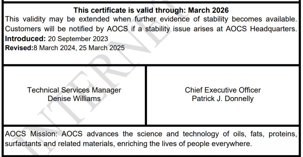 稳定性AOCS认证参考物质每年进行稳定性测试,证书可根据测试结果延长。客户可以要求延长证书,但他们被告知,结果是基于从AOCS库存中获得的样品。AOCS无法保证我们不再清点的批次样品的完整性。