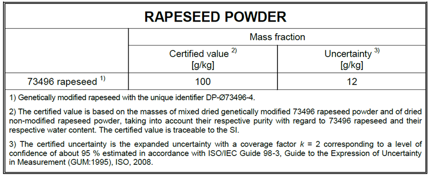 提醒用户,该参考材料的油菜籽质量分数为73496,应用于以质量分数表示的测量。测量单位不应改变,特别是当发现用于生产ERM-BF434e的两种粉末中的DNA质量分数之间存在显著差异(95%置信水平)时。