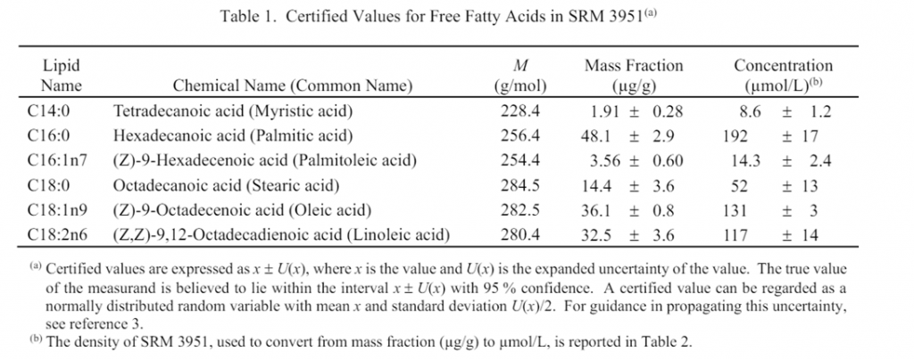 认证值:SRM 3951中固有游离状态的选定脂肪酸的认证值如表1所示。NIST认证值是指NIST对所有已知或怀疑的偏差来源进行评估的置信度最高的值[1]。这些值是根据NIST使用气相色谱法进行的测量以及实验室间研究的结果分配的。这些值可追溯到衍生的物质浓度质量分数和量的国际单位制[2]。