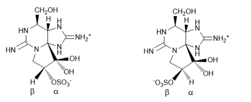从亚历山大藻的实验室培养物中分离出N-磺基氨基甲酰基gonyautoxin-2和-3(C1&2),化学转化为dcGTX2和dcGTX3,然后通过几个色谱步骤纯化[3]。dcGTX2和3的结构和纯度通过LC-MS/MS[4](图1和图2)和1H NMR进行了确认。使用LC高分辨率MS(LC-HRMS)对dcGTX2和dcGTX3的[m+H]+离子获得了353.0873的测量准确m/z(C9H17N6O7S+∆=0.3 ppm)。通过LC-ox-FLD[5](图3)、紫外毛细管电泳(CE-UV)和化学发光氮检测(LC-CLND)[6]进一步评估纯度。