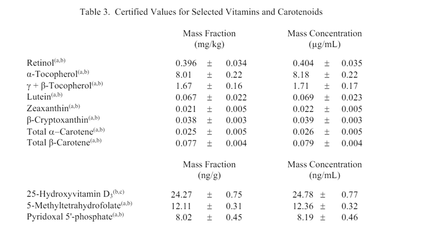 (b) 每个值提供的不确定度是关于平均值的扩展不确定度,以大约95%的置信度覆盖被测量;它表达了观察到的方法结果之间的差异及其各自的不确定性,以及B类成分,符合ISO/JCGM指南及其补充1[2-4]。对于类胡萝卜素,B类成分包括样品制备和标准品纯度;对于维生素,包括的B型成分与分析有关。扩展不确定度计算为U=kuc,其中uc旨在表示在一个标准偏差的水平上,不确定度的组合分量的影响,k是对应于每个分析物约95%置信度的覆盖因子。对于认证值,k=2。