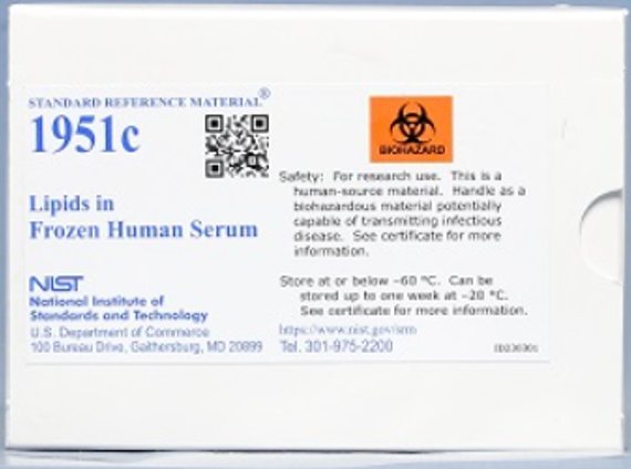 NIST认证值是指NIST对其准确性具有最高信心的值,因为所有已知或怀疑的偏差来源都已被调查或考虑[1]。总胆固醇和总甘油酯的值基于NIST和CDC使用ID-GC-MS分析结果的平均值。每个认证值提供的不确定度是平均值的扩展不确定度,以覆盖约95%的置信度;它包含了与分析相关的B类不确定度分量,并表达了方法结果之间观察到的差异及其各自的不确定度,符合ISO/JCGM指南[2,3]。扩展不确定度计算为U=kuc,其中uc是组合不确定度,k是对应于每个分析物约95%置信度的覆盖因子[2]。对于表1中所示的认证值,k=2。被测物是表1中列出的每种分析物的浓度值。计量可追溯性是指物质浓度(以毫摩尔/升表示)和质量浓度(以毫克/分升表示)的国际单位制衍生单位。NIST和美国疾病控制与预防中心(CDC)的脂质参考实验室通过同位素稀释气相色谱-质谱法(ID-GC-MS)测定了认证值[4-7]。NIST和CDC用于测量总胆固醇的方法以及NIST用于测量总甘油酯的方法被实验室医学可追溯性联合委员会(JCTLM)认定为高阶参考测量程序[8]。认证浓度仅适用于解冻至室温20°C至25°C的血清(见“储存”和“使用”)。