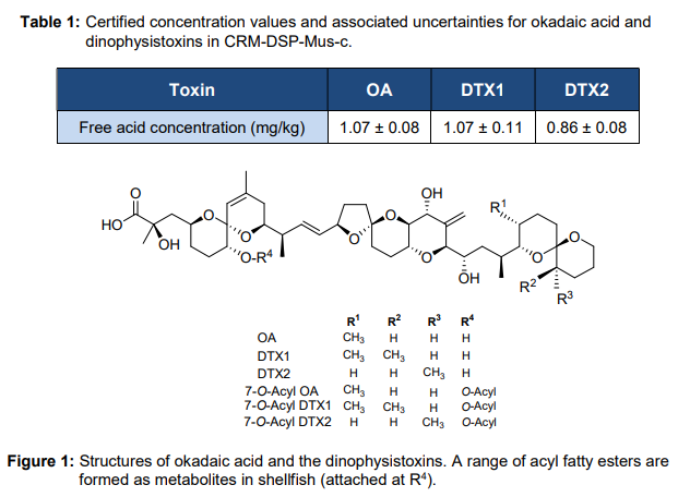 腹泻性贝类中毒(DSP)是一种由摄入被某些甲藻菌株产生的毒素污染的贝类引起的胃肠道疾病[1]。与DSP相关的主要毒素是冈田酸(OA)和二甲藻毒素DTX1和DTX2(图1)。CRM-DSP-Mus-c是一种含有OA、DTX1和DTX2的贻贝组织(贻贝)匀浆。这种材料中还存在软骨藻酸(DA)和表观DA(图2),以及OA和DTX的酰基酯。表1和表2列出了已确定认证值的分析物及其扩展的不确定性(UCRM)。表3显示了存在的DSP毒素的酰基酯的信息值,而表4显示了单个DA和epiDA浓度的信息值。
