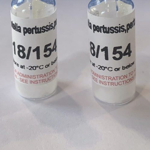 材料用途:印度血清研究所慷慨捐赠了纯化的百日咳杆菌素。编码为18/154的安瓿是按照国际生物标准(第29届欧洲生物标准委员会报告,1978年)的程序制备的。将已知浓度的百日咳杆菌素溶液稀释,得到含有25mM tris pH 8.0、0.15M NaCl、1%海藻糖和20微克百日咳杆菌素的溶液。将溶液以0.5ml等分分配到安瓿中。将安瓿溶液冻干,在氮气下通过玻璃热熔密封安瓿,并在-20°C的黑暗中储存。出于实用目的,每个安瓿含有相同量的百日咳杆菌素。每个安瓿的全部内容物应完全溶解在精确测量的溶剂(蒸馏水、生理盐水或缓冲液)中,并在使用前保持溶液冷却(例如在+4°C下)。不应试图称量冻干粉的比例。建议将溶液储存在-20°C或以下,不要立即使用。应避免反复冷冻和解冻。安瓿不含抑菌剂,不应认为制剂是无菌的。